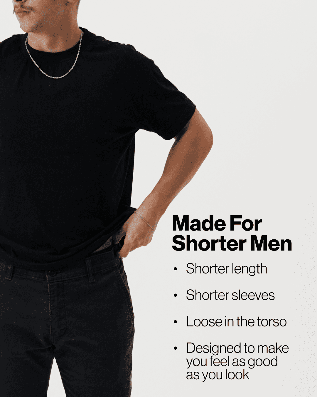 All of our garments are made so shorter men can leave the house with confidence.